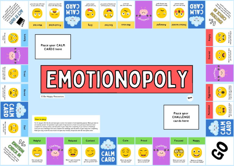 Emotionopoly turns social-emotional learning into a playful routine. As children move around the board, they identify emotions, practice calming strategies, and reflect using age-appropriate prompts.